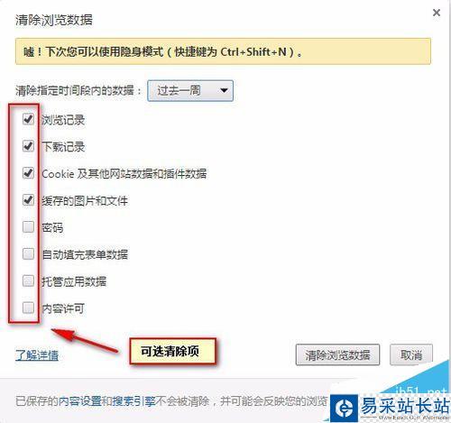 5、顯示清除瀏覽數據窗口,窗口左邊的多項選擇可以勾選想要清除的數據項