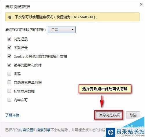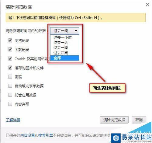 6、如果要清空所有瀏覽數據,可以在下拉欄中指定清除多少時間段內的數據,選擇最下面的一項即為清除全部數據
