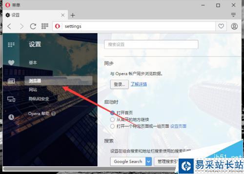 5、在“設(shè)置”對(duì)話框中,選擇左側(cè)窗格的“瀏覽器”選項(xiàng)卡。如圖所示;