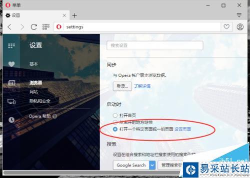6、在“瀏覽器”選項(xiàng)卡的右側(cè)窗格,找到“啟動(dòng)時(shí)”下的“打開(kāi)一個(gè)特定頁(yè)面或一組頁(yè)面”選項(xiàng)并將其勾選。再點(diǎn)擊“設(shè)置頁(yè)面”按鈕。如圖所示;