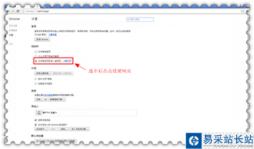 2、選中啟動時選項中的"打開特定網(wǎng)頁或一組網(wǎng)頁"然后點擊后面的設(shè)置網(wǎng)頁;