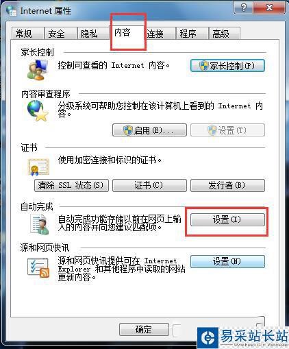 2、在打開的“Internet選項(xiàng)”窗口中,切換至“內(nèi)容”選項(xiàng)卡,然后點(diǎn)擊“自動(dòng)完成 設(shè)置”按鈕進(jìn)入。
