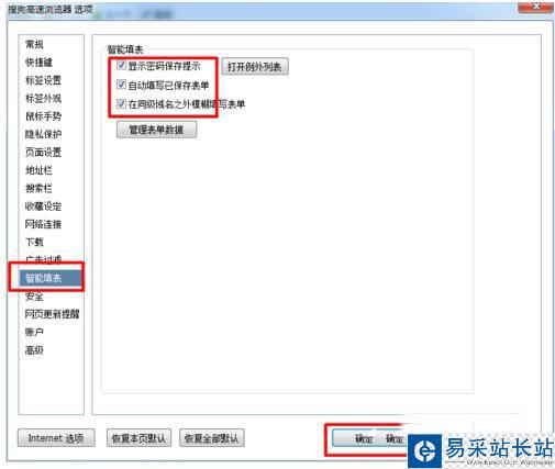 2、切換至“智能填表”選項(xiàng)卡,同時(shí)勾選三個(gè)選項(xiàng),并點(diǎn)擊“確定”完成保存按鈕即可。