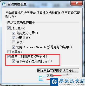 3、在打開的窗口中勾選“表單上的用戶名和密碼”和“在保存密碼之前詢問我”項(xiàng),最后點(diǎn)擊“確定”完成設(shè)置。