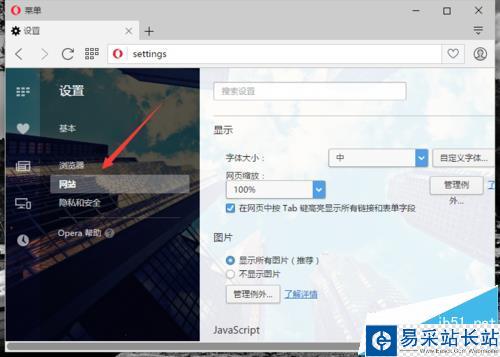 5、在“設置”對話框中,選擇左側窗格的“網站”選項卡。如圖所示;