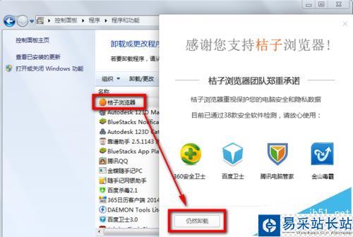 3、在卸載程序中找到桔子瀏覽器,雙擊鼠標左鍵會彈出窗口,我們選擇仍然卸載。