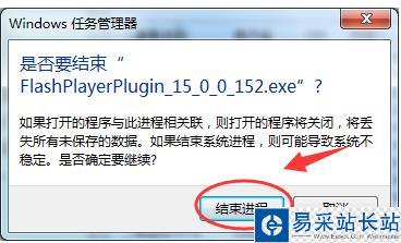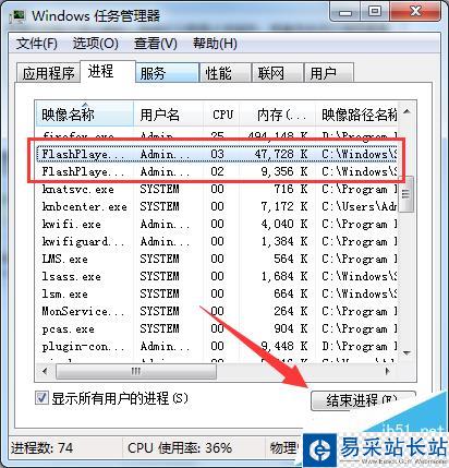 windows任務管理器對話框,找到flash player.exe進程。點擊“結束進程”