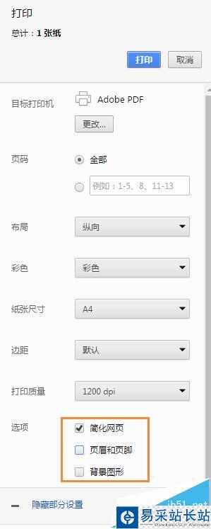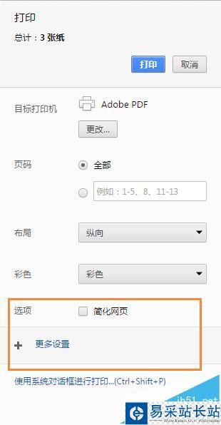 2、在選項處,將簡化打印勾上或者點擊更多操作選擇簡化打印選項可以過濾掉網頁上多余的內容。
