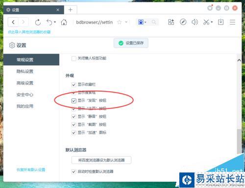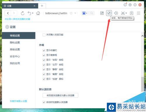 6、在“常規(guī)設(shè)置”選項(xiàng)卡中,找到“外觀”下的“顯示‘發(fā)現(xiàn)’按鈕”選項(xiàng),并將其勾選即可。如圖所示;