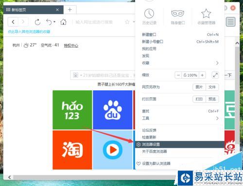 3、在彈出的菜單選項(xiàng)中,點(diǎn)擊“瀏覽器設(shè)置”命令選項(xiàng)。如圖所示;