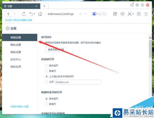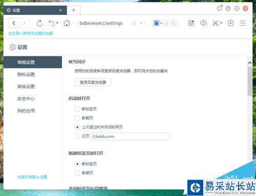 4、點(diǎn)擊“瀏覽器設(shè)置”命令選項(xiàng)后,這個(gè)時(shí)候會(huì)彈出瀏覽器“設(shè)置”對(duì)話窗口。如圖所示;