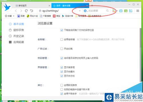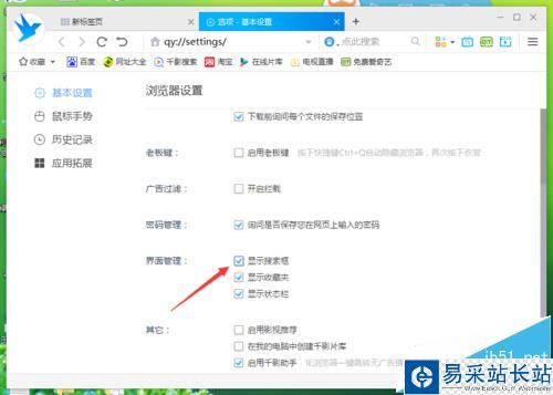 6、在“基本設置”選項卡的右側窗口中,找到“界面設置”下的“顯示搜索框”選項,并將其勾選即可。如圖所示;
