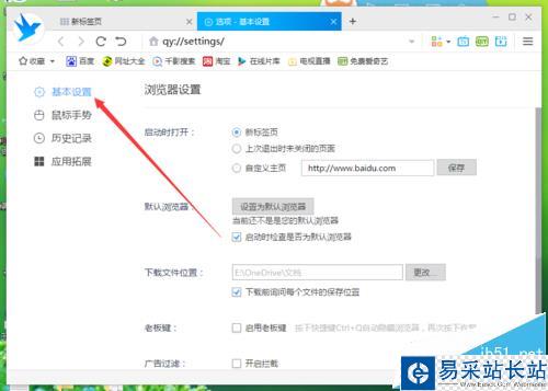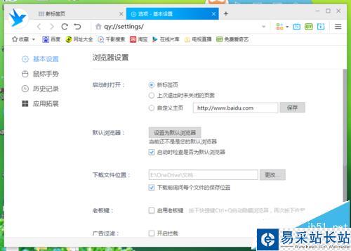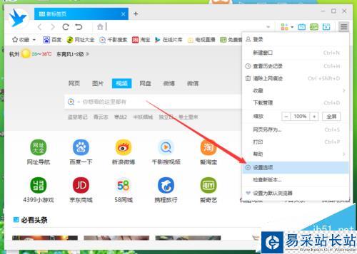 4、點擊“設置選項”命令選項后,這個時候會彈出瀏覽器“選項-設置”對話框。如圖所示;