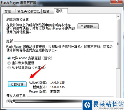 第三步:檢查更新,將FlashPlayer升級至最新版本;