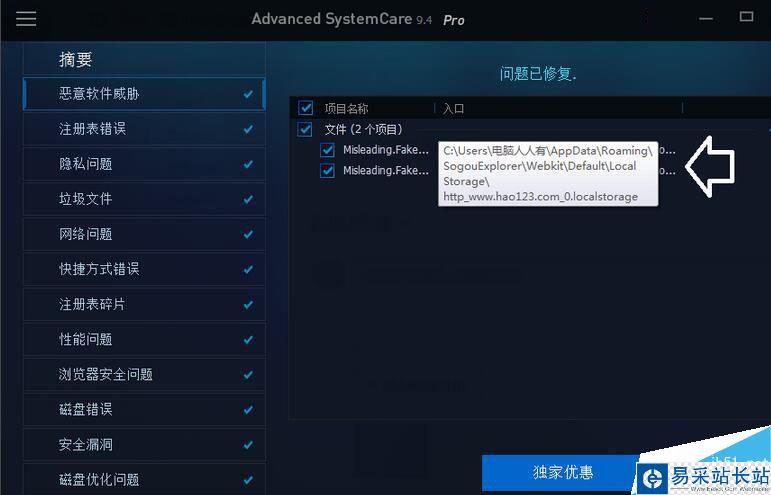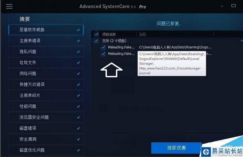 搜狗瀏覽器被劫持,使用Advanced SystemCare優化軟件→勾選惡意軟件清除→掃描。
