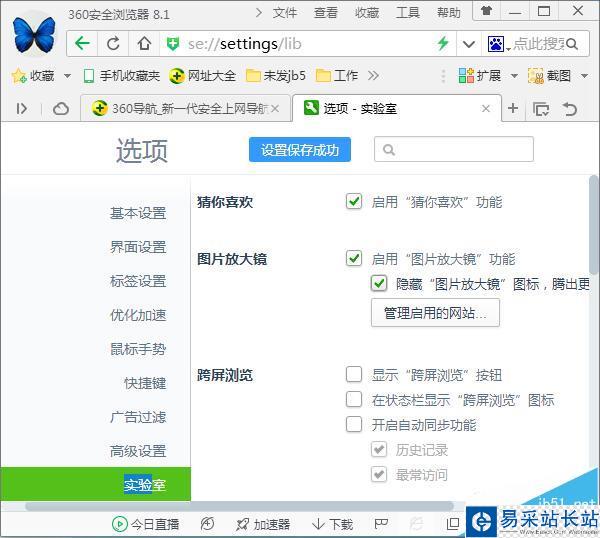 4、點擊“實驗室”,可以看到“圖片放大鏡”選項,點擊啟用“圖片放大鏡”功能和隱藏“圖片放大鏡”圖標,騰出更多區域來顯示圖片,都打勾,然后就自動保存了。