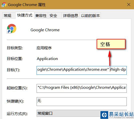 2、在目標一欄中增加自定義參數 /high-dpi-support=1 /force-device-scale-factor=1 注意,參數和原本的內容之間要有個空格,示例如下: