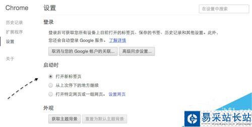 隨后在 Chrome 瀏覽器的設置頁面列表中,有一個【啟動時】欄目,在默認情況下它的選項應該是“打開新標簽頁”一欄選項。如果當前主頁被篡改以后,請重新選擇這一欄選項即可恢復。
