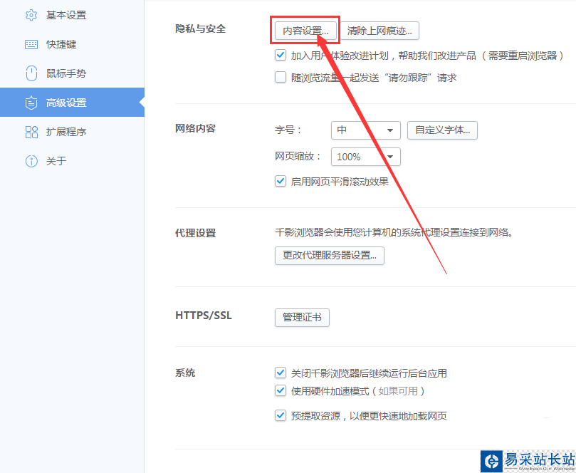 5、在跳出高級(jí)設(shè)置界面找到【內(nèi)容設(shè)置】點(diǎn)擊進(jìn)入