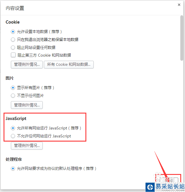 6、跳出內(nèi)容設(shè)置界面找到【JavaScript】點(diǎn)擊你想設(shè)置的前面點(diǎn)上點(diǎn),最后點(diǎn)擊【完成】