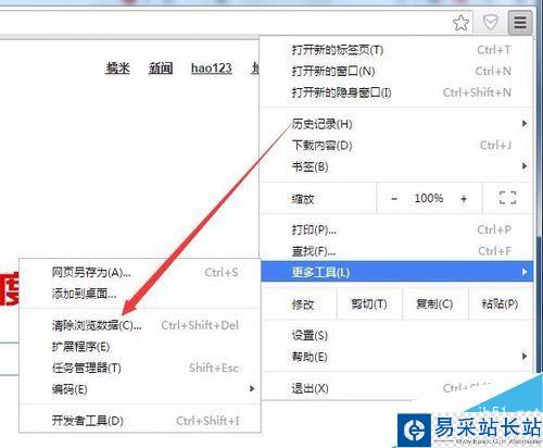 在打開的菜單中依次選擇“更多工具/清除瀏覽數據”菜單項