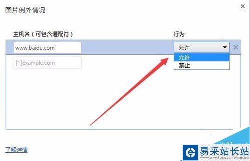 在主機名一項中找到指定的網頁,然后點擊行為下拉菜單,在彈出菜單中選擇“允許”菜單項,最后點擊完成按鈕,這樣再次打開網頁,一般就可以正常顯示了。