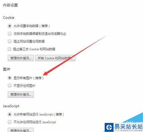 在打開的內容設置窗口中,選中“顯示所有圖片”一項