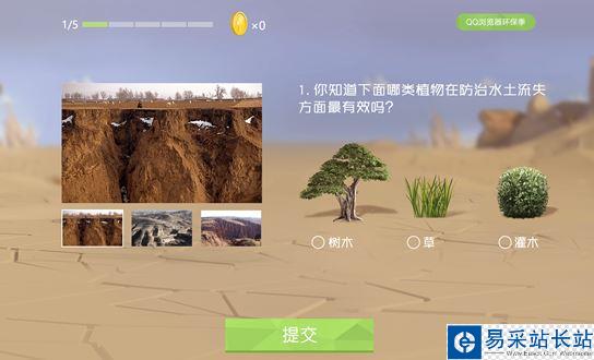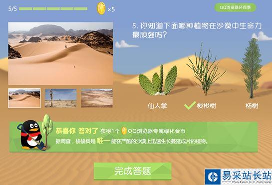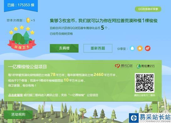 點(diǎn)擊進(jìn)入活動(dòng)頁面,按照提示回答5個(gè)環(huán)保相關(guān)問題,如果能夠答對3道或者更多,就可以捐贈(zèng)出去,騰訊就會(huì)在阿拉善荒漠種下一顆梭梭。