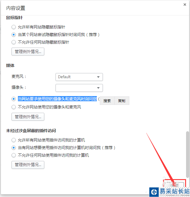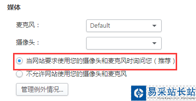 6、進入內容設置后往下拉可以看到【媒體】中的【當網站要求使用您的攝像頭和麥克風時詢問您】前面打上點