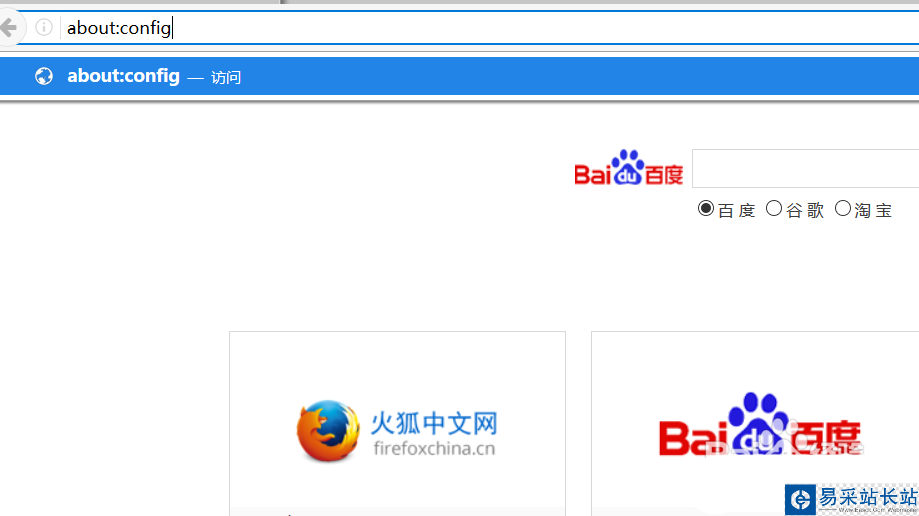 2、在Firefox地址欄輸入“about:config”,然后打開;