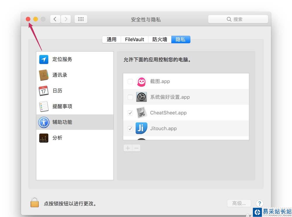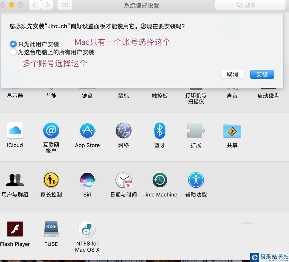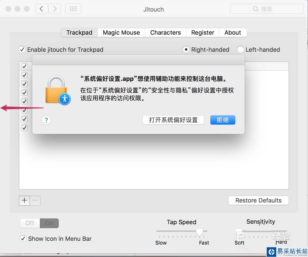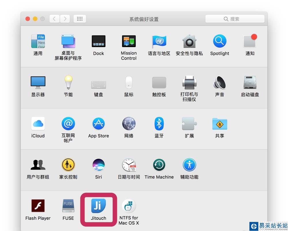 2、在系統(tǒng)偏好設(shè)置中就多了這個(gè)jitouch圖標(biāo),點(diǎn)擊它,然后它依舊會(huì)提示你加入隱私,先把它拖到一邊不用理會(huì)。就是圖二箭頭的圖標(biāo)。