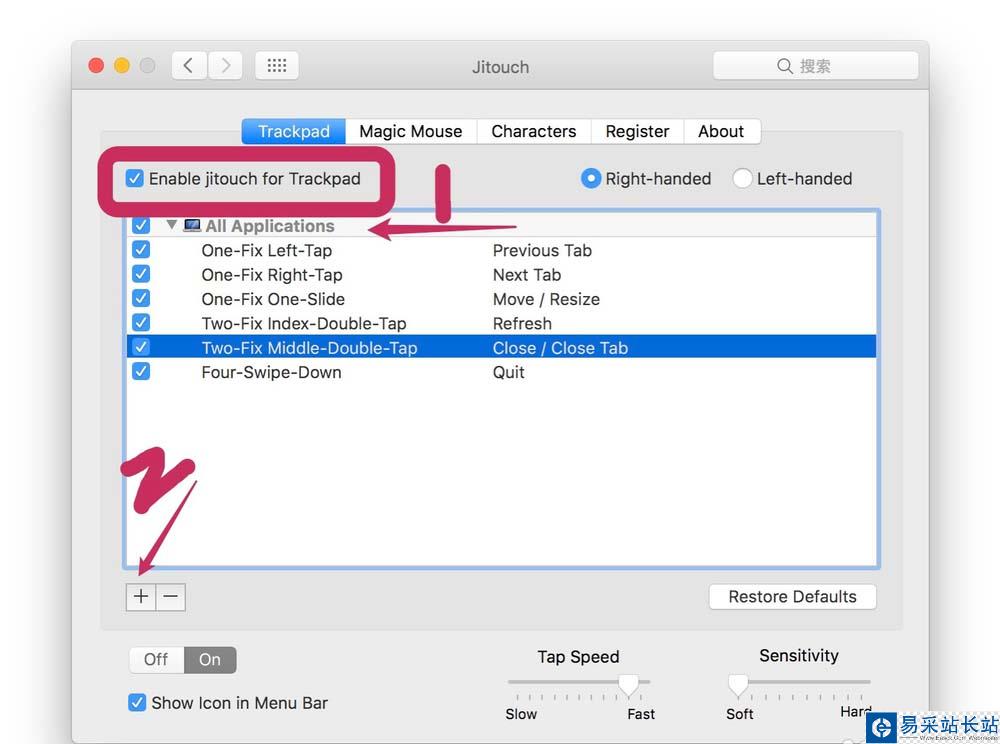 4、設(shè)置觸控板的手勢方便在Safari上面關(guān)閉標(biāo)簽刷新切換標(biāo)簽,點(diǎn)擊1開啟觸控板功能,二添加手勢或者刪除手勢。你可以對照我這里設(shè)置手勢,基本滿足了所有的功能而且觸發(fā)率高不會(huì)對原有的手勢造成沖突。