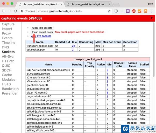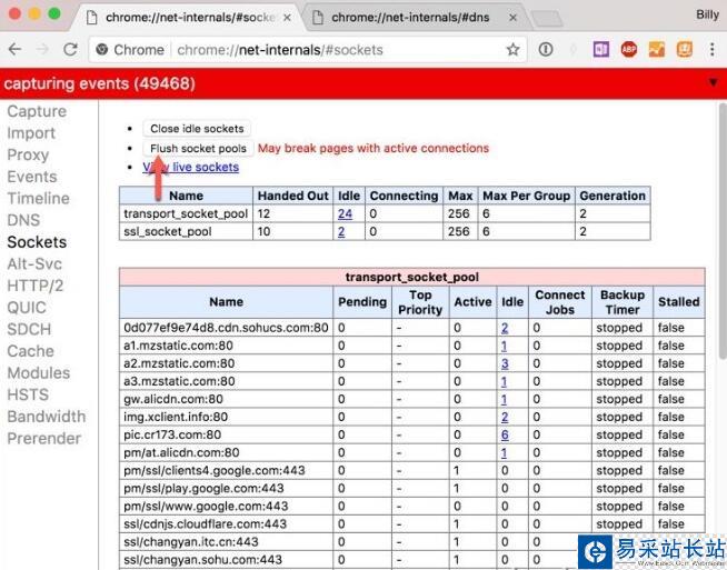 4、根據結果,可能還需要刷新套接字緩存。 執行下面的 URL 以訪問 sockets 頁面:chrome://net-internals/#sockets