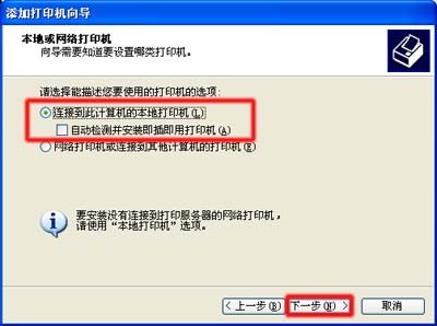 在“本地或網絡打印機”窗口中,選擇“連接到此計算機的本地打印機”選項,勾除“自動檢測并安裝即插即用打印機”選項,然后點擊“下一步”按鈕。如圖 2 本地或網絡打印機所示: