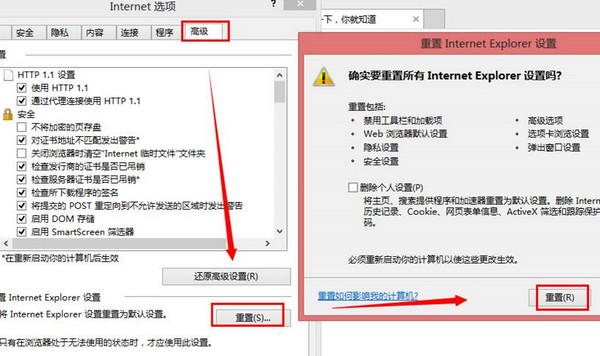 ②如果有,則進入internet選項 =》高級 =》重置IE瀏覽器。