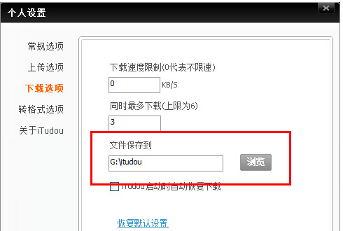 4、我們可以更改下載視頻存放的地方,點擊“瀏覽”,例如,我在 G:盤新建了一個名為 itudou 的目錄,然后把下載視頻的位置更改為G:itudou,然后點擊“確定”。