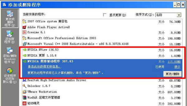 第二步:在安全模式的控制面板添加刪除中把顯卡驅動刪除干凈: