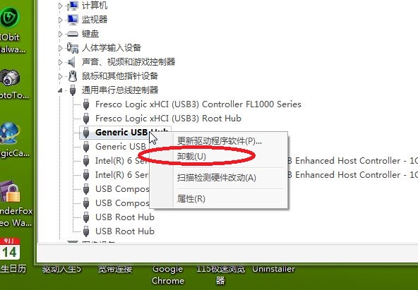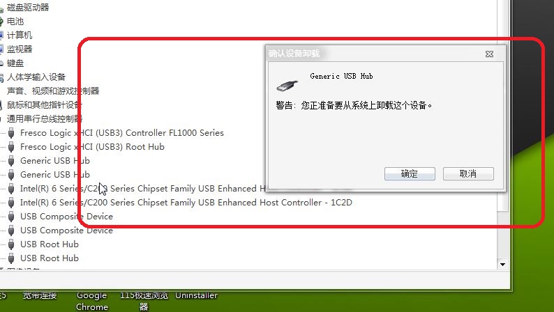 可是我怎么能記住那名字呢?還是用我的土辦法,挨個實驗,逐個卸載,哪一個卸載之后,鼠標底板的紅燈滅了,那個就是對應的USB接口了。