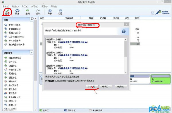 4、點擊分區助手左上角“提交”出現(等待執行操作的對話窗口)。在點擊“執行”即可。