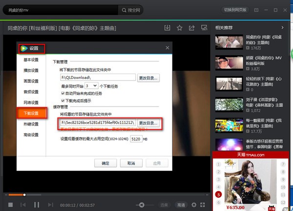 第四步:在“設置”中選擇“下載設置”,查看如下圖所示的視頻播放緩存記錄存儲位置,并通過電腦找到此目錄。