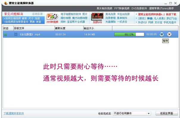 7、完成所有設置之后,就可以對視頻格式進行轉(zhuǎn)換或合成了,點擊貍窩全能視頻轉(zhuǎn)換器右下角一個大大的圓圖標則開始執(zhí)行操作