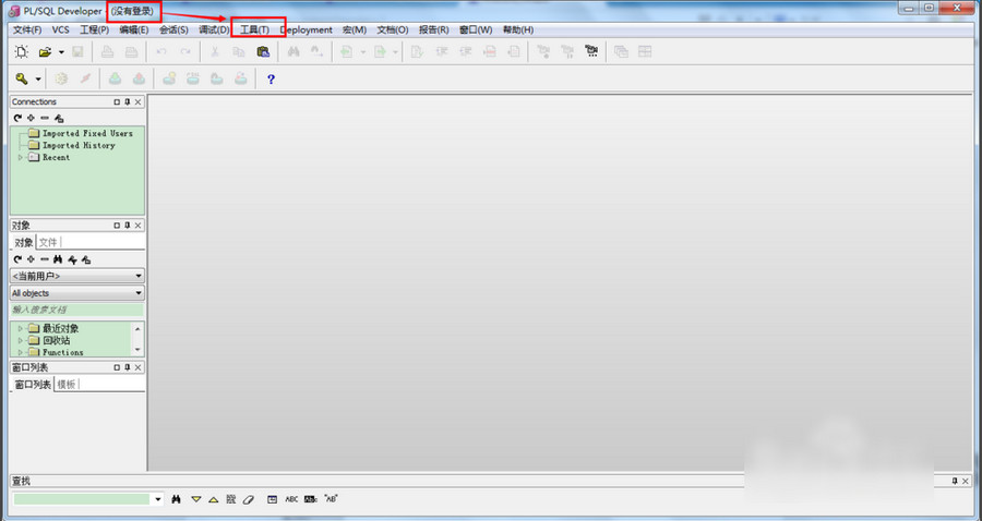 2、首先打開PLSQL界面彈出登錄框這個時候您很沖動的輸入了正確的用戶名密碼,以及ip地址端口號,但是您點擊確定時彈出如下第一張圖所示這說明您本機沒有安裝Oracle客戶端或者PLSQL工具首選項中沒有配置正確.因此直接點取消,PLSQL會自動打開軟件如下第二圖.您會看到軟件的左上方提示沒有登錄