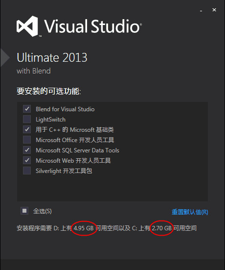 4、在選擇安裝的可選功能這里,大家可以根據(jù)自己需要勾選,也可以默認(rèn)全選。這里有個小功能,把鼠標(biāo)放在文字上,會彈出各個功能的詳細(xì)描述。小編選擇四個常用的功能,另外要注意預(yù)留空間,開始安裝。