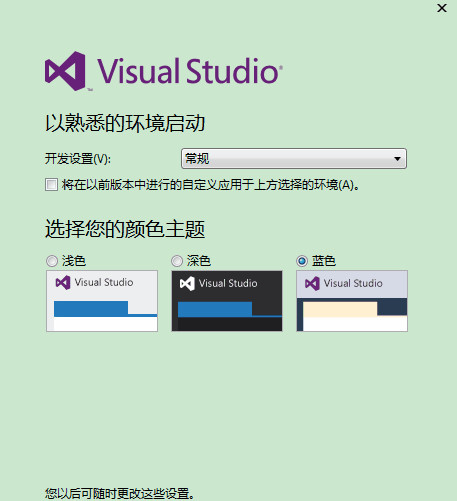 6、第一次打開可能需要進行一些基本配置,如開發(fā)設(shè)置、顏色主題,根據(jù)自己的需求設(shè)置,然后等待幾分鐘就可以使用。由于VS2013引入了一種聯(lián)網(wǎng) IDE 體驗,大家可以使用微軟的賬戶登錄,而且其還自動采用聯(lián)網(wǎng) IDE 體驗的設(shè)備上同步設(shè)置,包括快捷鍵、Visual Studio 外觀(主題、字體等)各種類別同步的設(shè)置