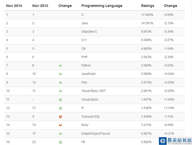 2014年11月編程語言排行榜昨天發布,前三名仍然沒有變化,C、Java、Objective-C。但因為大數據的炒作,本月R躍升至12位,上個月排名15。