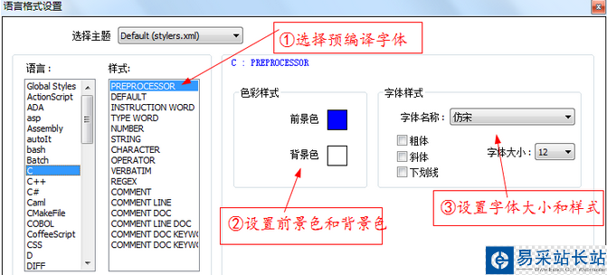 3、設(shè)置預(yù)編譯字體格式。接著上一步驟,我們在“樣式”的那一欄中選擇“PREPROCESSOR”表明我們要對預(yù)編譯字體進(jìn)行設(shè)置,具體操作情況如下圖所示