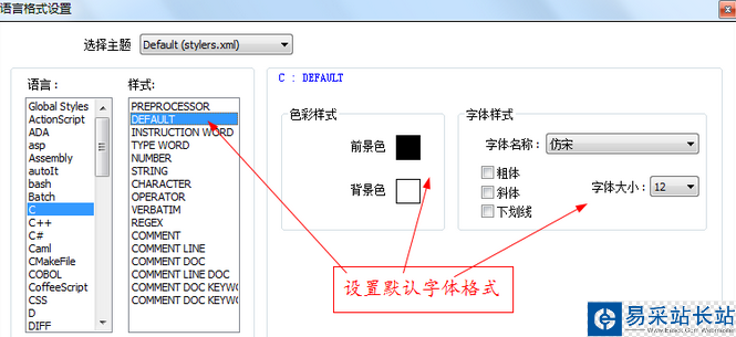 2、選擇“語言格式設(shè)置”后,系統(tǒng)會(huì)自動(dòng)彈出語言格式設(shè)置對話框。接下來我們選擇“C”表示我們將對.c格式的文件進(jìn)行設(shè)置,具體操作情況如下圖所示