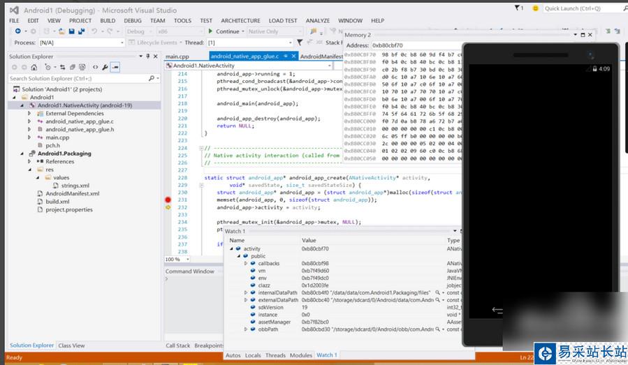 5、最后在Visual Studio 2015進行android native activity開發時進行調試的效果圖