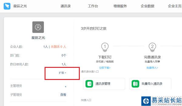 2、如果已經認證了企業了,需要去釘釘電腦端網頁管理后臺,去擴容企業通訊錄,如下圖所示:
