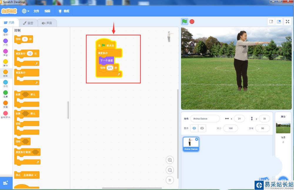 9、點擊綠旗執行程序,一個跳舞動畫就制作好了。